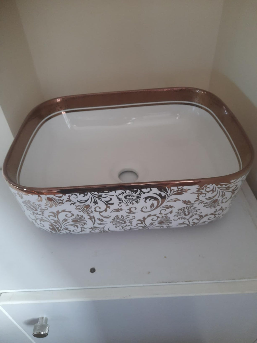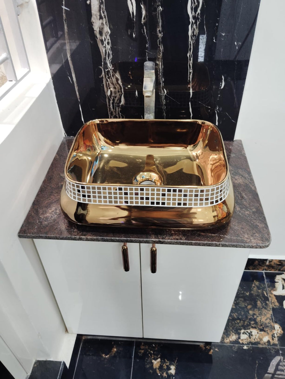 View full detailsDesigner Ceramic Basin (Gold Rim, Multicolor Hexagon Design 24x16x6 In BTT-11557)