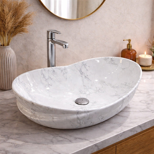 Upgrade your bathroom with the elegant BASSINO Luxury Countertop Wash Basin crafted from premium quality ceramic with a sophisticated white marble ...