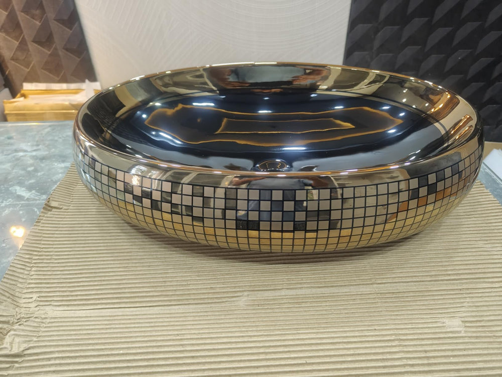 Premium oval countertop ceramic basin featuring a luxurious Gold rim paired with a vibrant multicolor hexagon pattern around the exterior. The play...