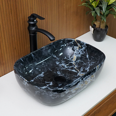 Striking and sophisticated, the BTT-11006-IN Designer Table Top Basin features a glossy black body adorned with golden marble-style veining. Its ro...