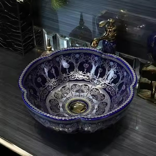 A premium round ceramic countertop basin featuring an elegant Glossy Blue finish with intricate floral artwork around the exterior and interior. Th...