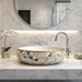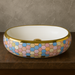 Premium oval countertop ceramic basin featuring a luxurious Gold rim paired with a vibrant multicolor hexagon pattern around the exterior. The playful color palette blends beautifully with the glossy white ceramic interior, giving your bathroom a stylish, modern, and artistic look.