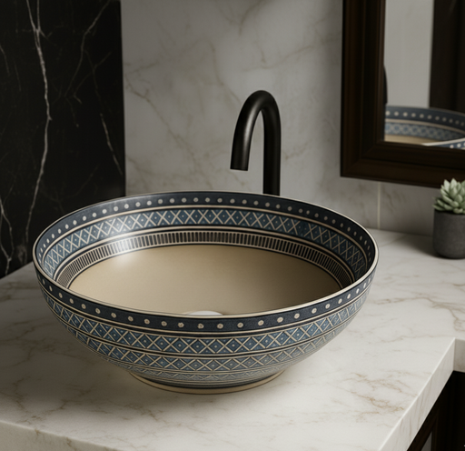 an elegant round ceramic countertop wash basin featuring a timeless beige interior paired with an intricate, patterned decorative border around the...