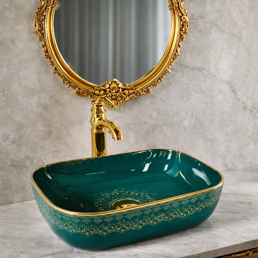 Green & Gold Designer Countertop Wash Basin | 18 × 13 × 5 Inch Luxury Bathroom Basin