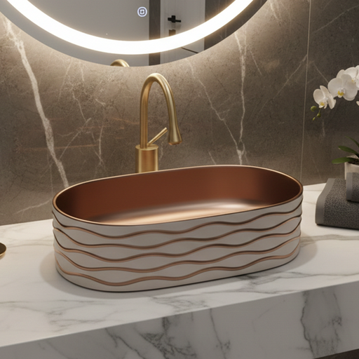 View full detailsLuxury Oval Table Top Wash Basin | Rose Gold Finish | Designer Ceramic Basin (22×13×6 Inch)