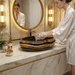 Its sculptural, layered design makes it a true statement piece—perfect for luxury homes, boutique hotels, and designer powder rooms. The high-gloss surface enhances depth and reflections, while the gold detailing adds richness and elegance.