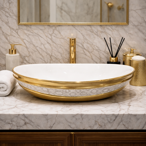 Luxury Gold Detailing Countertop Wash Basin | Designer Table Top Bathroom Basin (24" × 14" × 6" IN)