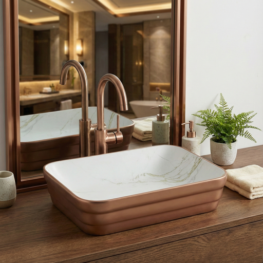 The NCTT 937 Designer Table Top Wash Basin blends bold geometry with rich metallic elegance. Featuring a rectangular silhouette with softly rounded...