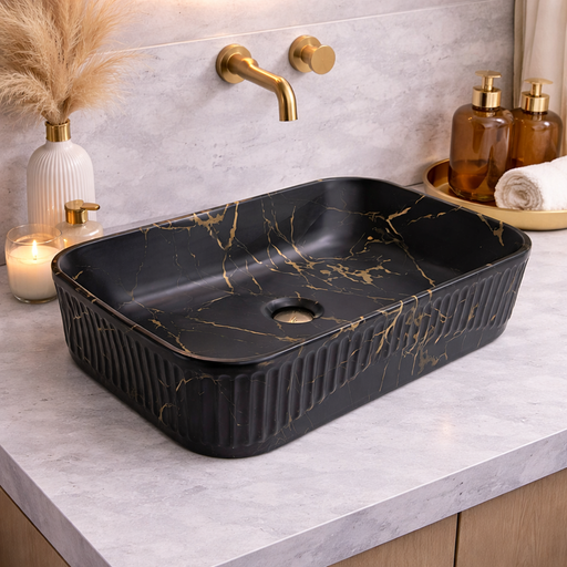 Elevate your bathroom aesthetics with the Rectangular Countertop Wash Basin, a striking blend of bold gloss black and elegant golden detailing. The...