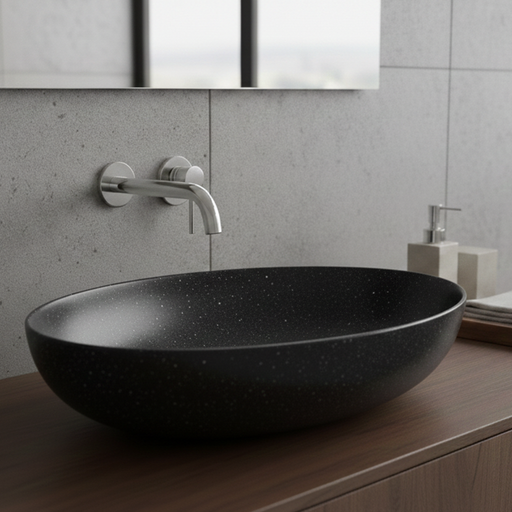 View full detailsTerrazzo Matt Black Countertop Wash Basin | Modern Oval Stone Sink (20″ × 16″ × 6″ IN)